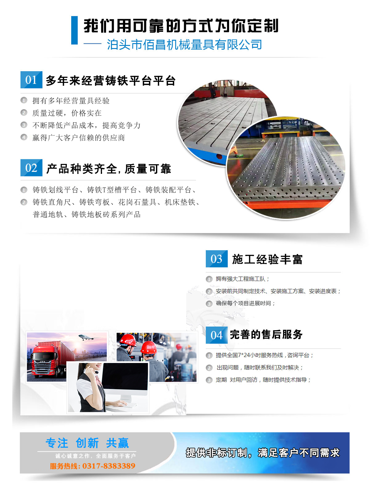 泊頭市佰昌機械量具有限公司坐落在有“鑄造之鄉”美稱的泊頭市,我公司自創建初期堅持誠信原則和不斷創新的原則,_為廣大用戶提供鑄鐵平板鑄鐵地板,劃線平臺等放心產品,我們的產品_程度高,得到了廣大用戶的高度認可。